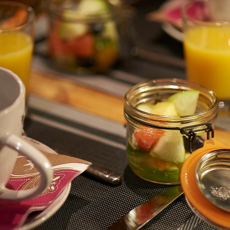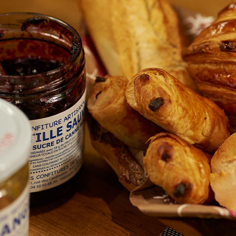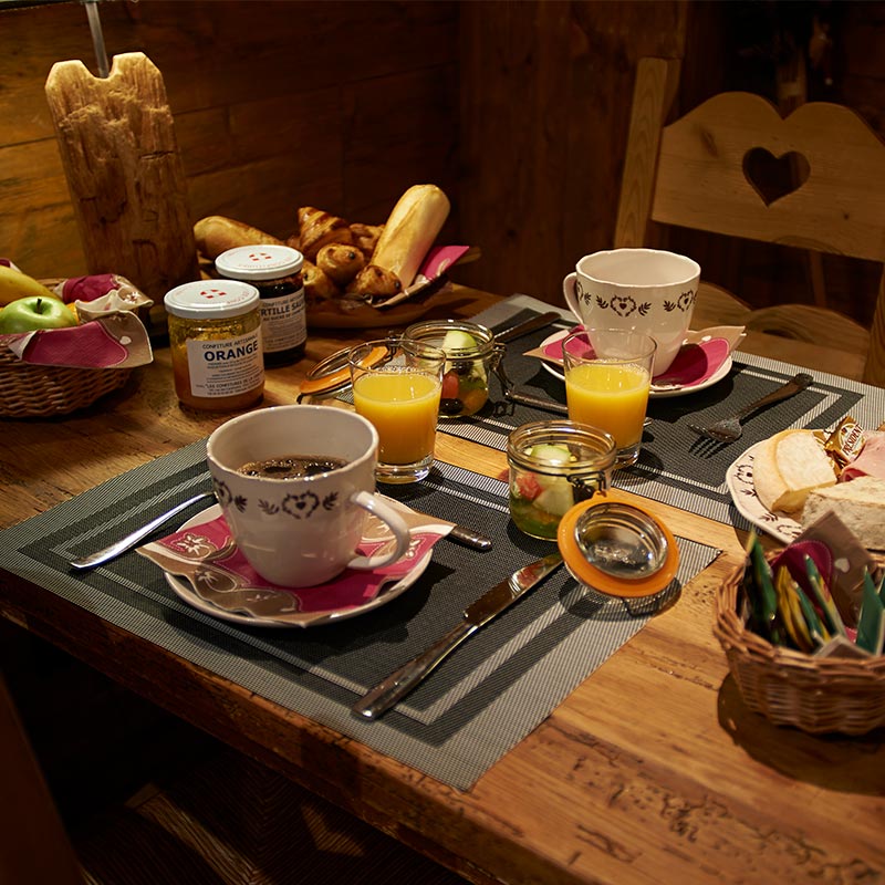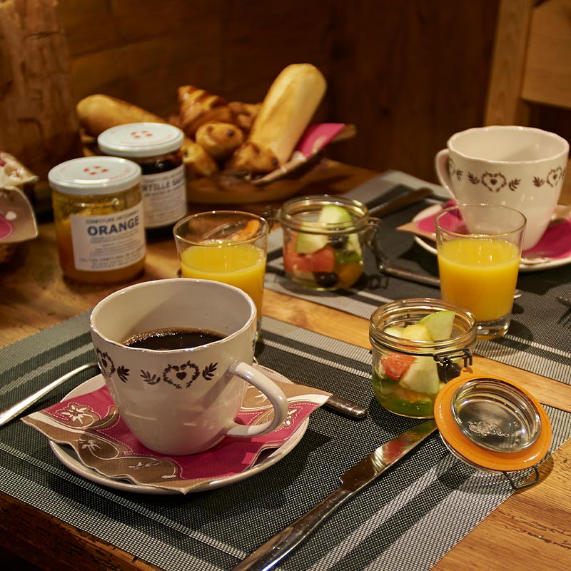 Il est proposé sur le buffet : viennoiseries et petits pains, fromages de montagne, jambon torchon, oranges fraîches à presser, salade de fruits frais « maison », yaourts, fromage blanc…sans oublier les confitures de Savoie aux multiples parfums à découvrir.